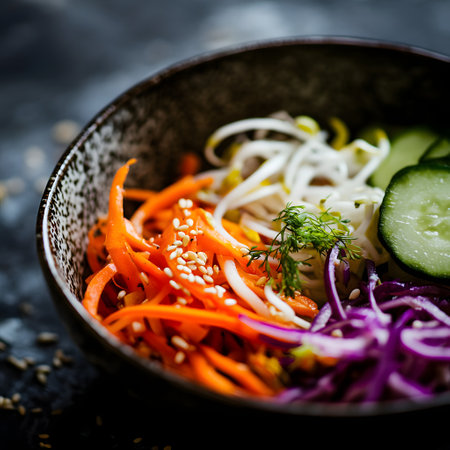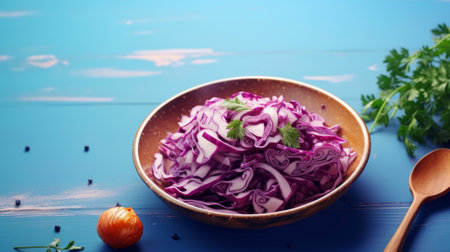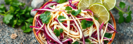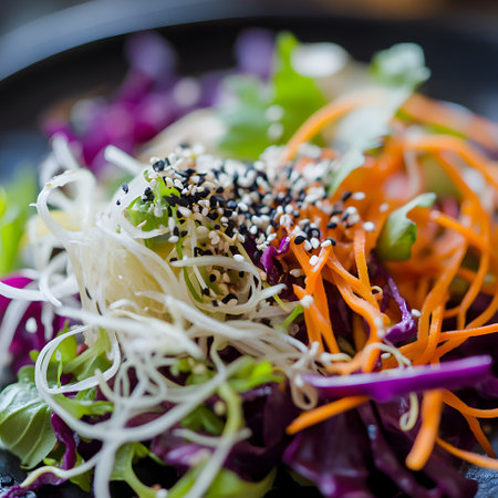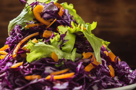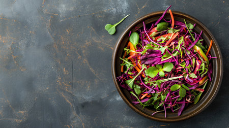 A vibrant and colorful fresh vegetable salad featuring purple cabbage, carrots, and greens. Perfect for healthy meals and culinary displays.