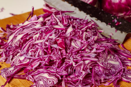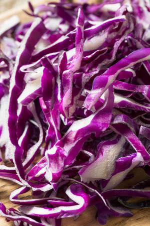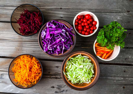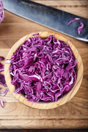 Sliced for cooking red cabbage in a bowl. Selective focus, grey wooden background