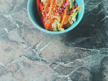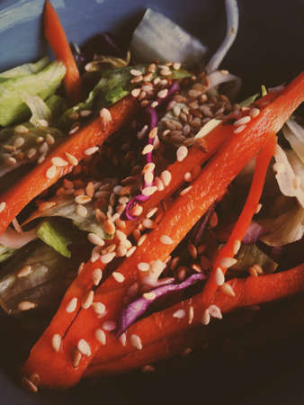Healthy vegetable salad with carrot, red onion, cucumber and dill on rustic background. Salad of fresh vegetables with sesame seeds in a bowl. Selective focus