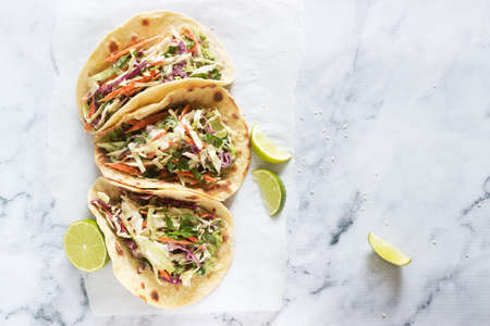 Tacos with guacamole and coleslaw served with lime slices on a light background.