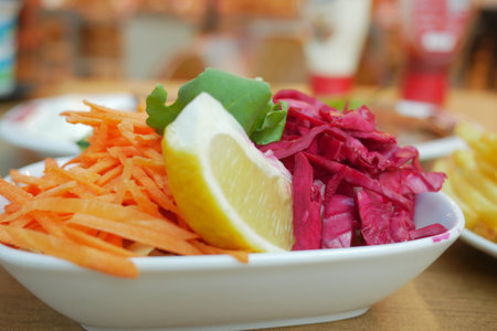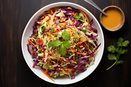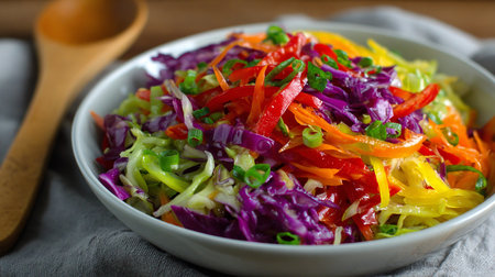 A vibrant bowl of fresh cabbage and vegetable salad, featuring colorful carrots and greens. Perfect for healthy meals, garnishing, or colorful presentations.