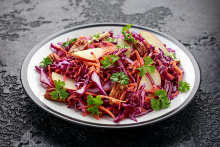 Fresh red cabbage salad, Coleslaw in a bowl on a dark background. Top view.