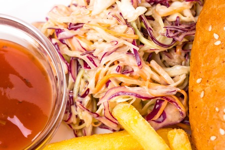 Chicken burger with french fries and coleslaw salad. Served with delicious ketchup. Macro. Photo can be used as a whole background.