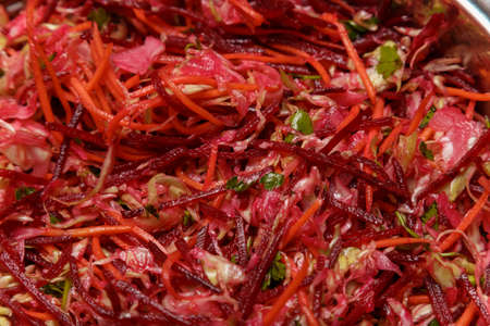 Close up shot of salad called Brush. Beetroot, carrots and cabbage cut into thin strips. Vegetarian, organic, healthy food, diet, nutrition.