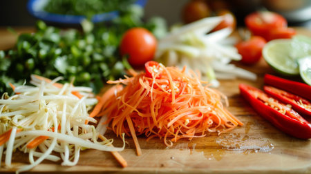 Close-up of som tam salad ingredients arranged on a wooden cutting board, including shredded green papaya, tomatoes, and Thai chili peppers, ready for preparation