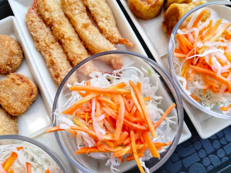 Colorful Shredded Cabbage Salad With Carrots and Herbs Prepared in the Kitchen