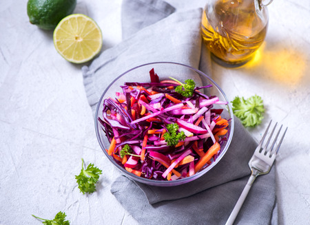 Red cabbage coleslaw with carrot on a light background. Healthy food concept.