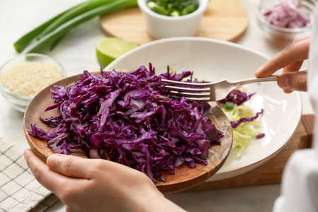 Female chef cooking tasty cabbage salad on table in kitchen, closeup