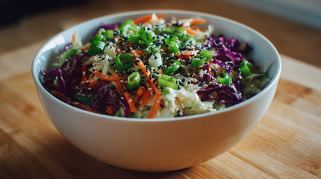 Fresh coleslaw salad in a ceramic bowl, perfect for healthy eating and recipe websites. With Generative AI technology.