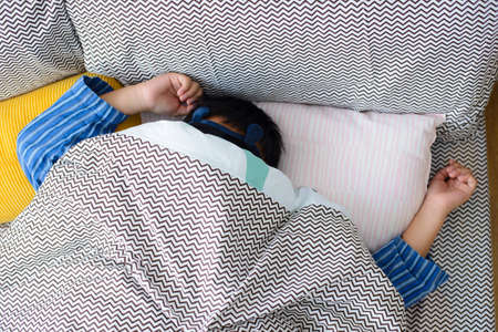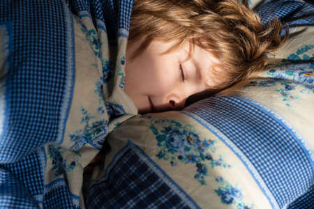 Top view of child sleeping cozily on a bed in Bedroom at Morning. Kids little boy sleeps on pillow.