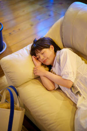 Photo young woman in casual clothes lay down to rest on the bed. Energy recovery people concept