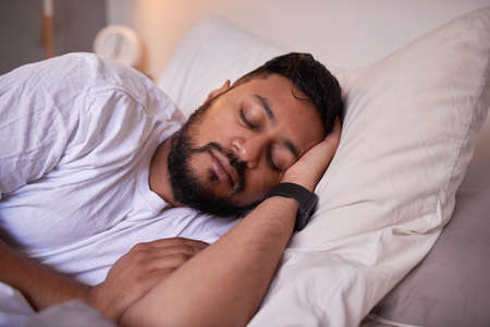 Handsome man sleeping in his bedroom. Man sleeping with alarm clock in foreground. Serene latin man sleeping peacefully.