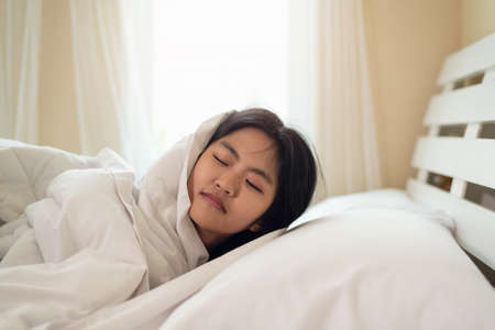 Young Asian woman lying on pillow in bed and curled up in blankets