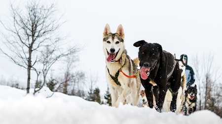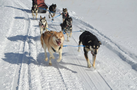 View of sled dog race on snow in France