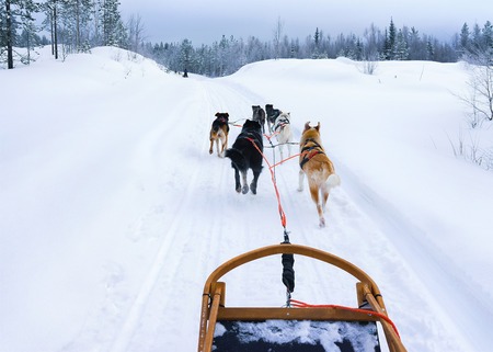 Sledding with husky dogs in Lapland Finland