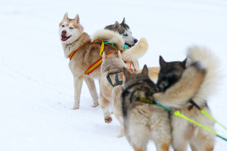 Happy and eager Alaskan husky sled dogs ready for action on a cold winters day. High quality photo