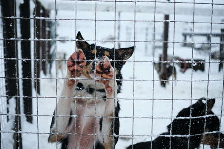 The dog behind the fence of the animal shelter has put its front paws on the net, wants to go out and find a new home. Kennel of northern sled huskies. It snows in winter.