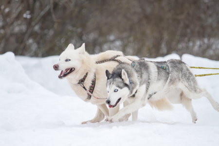 Running Husky dog on sled dog racing. Winter dog sport sled team competition. Siberian husky dog in harness pull skier or sled with musher. Active running on snowy cross country track road