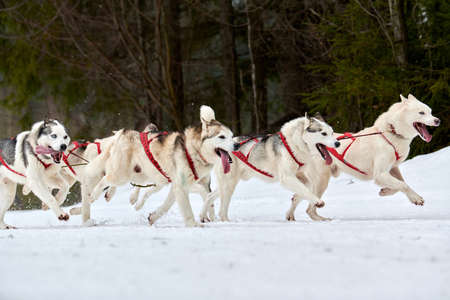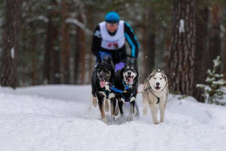 Sled dog racing. Husky sled dogs team in harness run and pull dog driver. Winter sport championship competition.