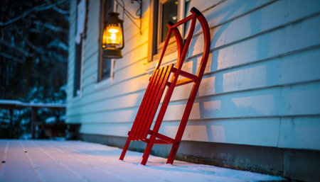 Classic red wooden sled leaning against white clapboard house exterior in snow with glowing lantern creating warm ambiance during blue hour twilight for holiday nostalgia