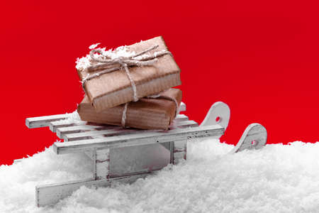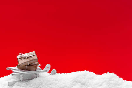 Festive red Christmas background. Composition with Christmas gift, snow and sled.
