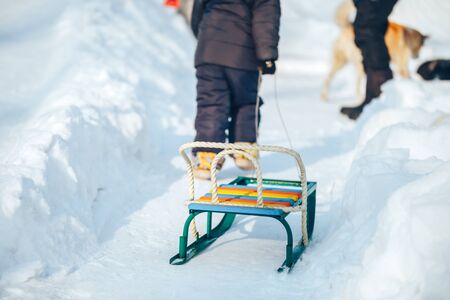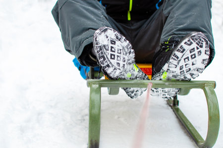 Winter holidays and games concept. The child is sitting on a sleigh. Close-up legs in the snow. Winter close-up