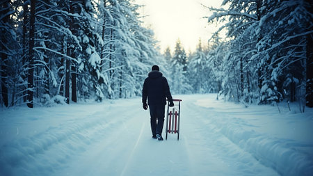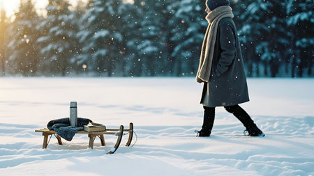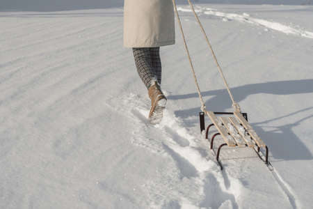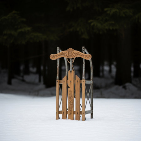 Wooden sled in a snowy landscape on a sunny winter day. Concept of winter activity, snow sports, childhood fun, outdoor adventure. Copy space.