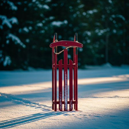 Beautiful red sled resting in soft snow with sparkling winter sunlight and blurred evergreen trees in the background