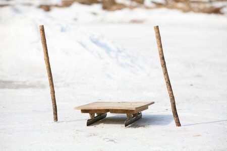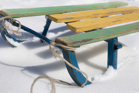 Schlitten Holz. Wooden vintage winter sled in the snow.