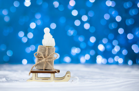 Christmas wooden toy sledge with gift standing in snow. Bokeh lights background.