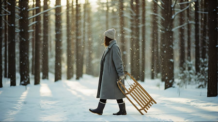 Young woman with a wooden sleigh in the winter forest. Winter walk.