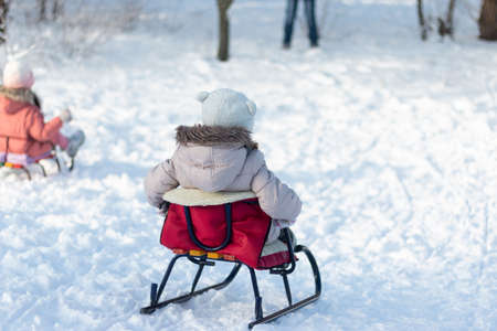 Active girl sliding down the hill. Happy child having fun outdoors in winter on sledge. Family time.