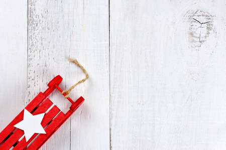 Winter holidays background: Santa Claus hat on a wooden made sleigh. Closeup