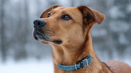 This image features a close-up portrait of a brown dog wearing a blue collar, capturing its curious expression amidst a snowy winter landscape, evoking feelings of serenity and nature.