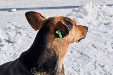 Stray dog with a special tag or clip on his ear. Green clip with symbols. The dog sits calmly on the street in the snow. The solution to the problem of stray dogs.
