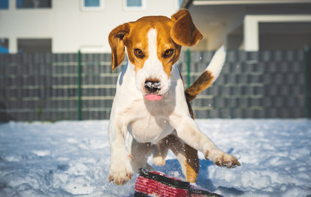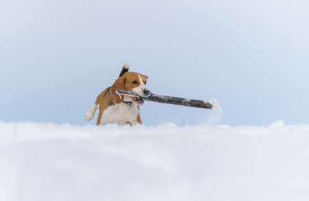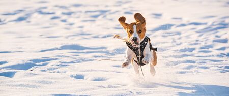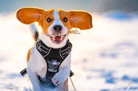 Beagle dog runs and plays in the winter field on a Sunny frosty day.