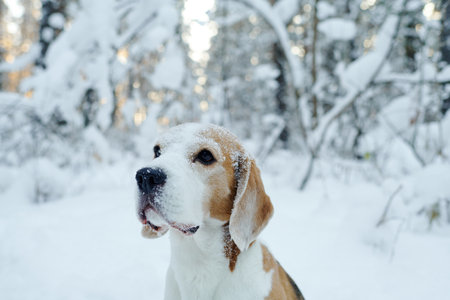 Dog breed Beagle walking in winter forest