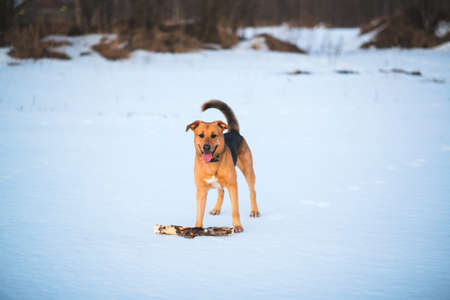 Brown with gray mongrel dog in winter on snow.