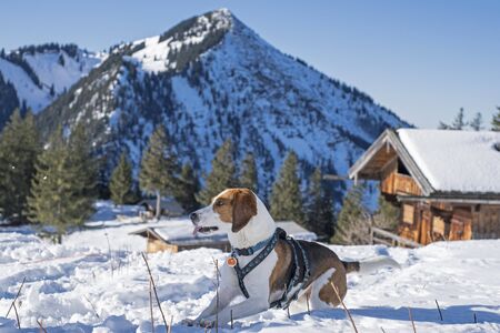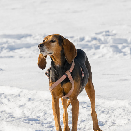 Small cute harrier puppy sitting outdoors on snow in Swedish nature and winter landscape. Nice beautiful portrait of young little dog. Joyful and happy image.