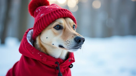 Cute dog wearing red winter coat and hat with pom-pom, photographed in a natural snowy forest. Concept of pet fashion and cold weather