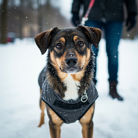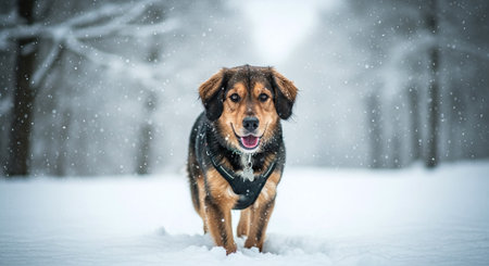 A curious pet dog enjoys the snowy wilderness, surrounded by a glistening winter landscape.