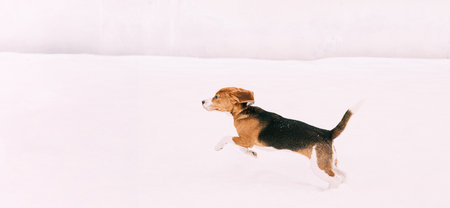 Tricolor beagle dog hound having fun in deep snow in winter. Happy dog outdoors in nature runs towards the camera.