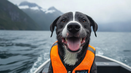 A joyful dog wearing a bright life jacket beams with excitement while enjoying a boat ride through tranquil waters surrounded by stunning mountains and fog.