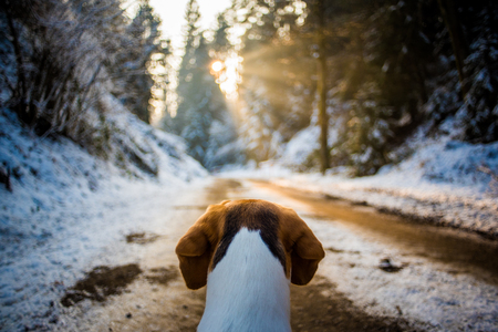 Beagle dog sits at the path watching sun rays
