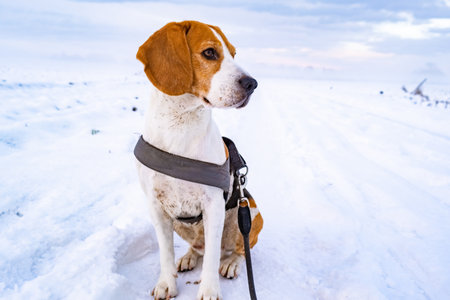 Smart beagle dog, winter, outdoor, snow meadow