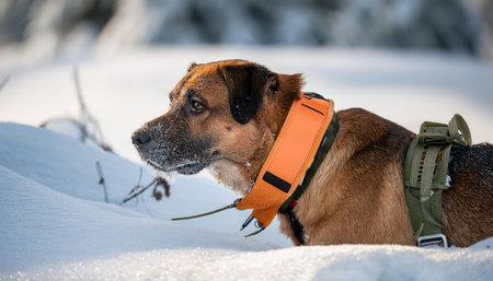Dog in the snow wearing a jacket and collar