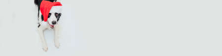 Funny cute smiling puppy dog border collie lying down wearing Christmas costume red Santa Claus hat isolated on white background. Preparation for holiday. Happy Merry Christmas concept, banner