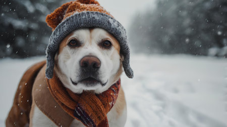 Adorable dog wearing a cozy winter sweater sits in a snowy setting, surrounded by trees and falling snowflakes, offering blank space for text.
