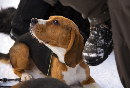 Beagle dog hunting at the feet of the owner. Winter