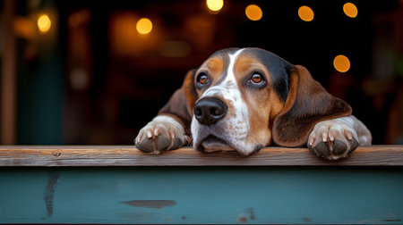 A beagle rests its paws on a wooden ledge, gazing thoughtfully with big eyes. Soft, warm lights in the background create a charming and inviting atmosphere.
